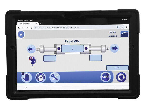 The intensifier web interface is accessible remotely via computer or smartphone to view operation, see any alarms and activate the emergency STOP command when necessary.