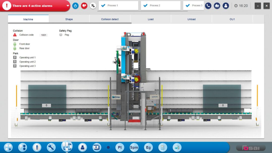 Ypsos is the newest vertical machining center developed by CMS, ideal to process float and laminated glass sheets, entirely designed thanks to many decades of experience in the glass industry. This is the first and only vertical CNC machining center capable of grinding and polishing with two heads at the same time. This project was conceived to reach the best reliability ever in the vertical CNC category. The new software has been designed to make the user interface more efficient and intuitive than ever. Based on the configuration selected. Ypsos can carry out seaming, polished and industrial grinding, milling and coaxial drilling operations.