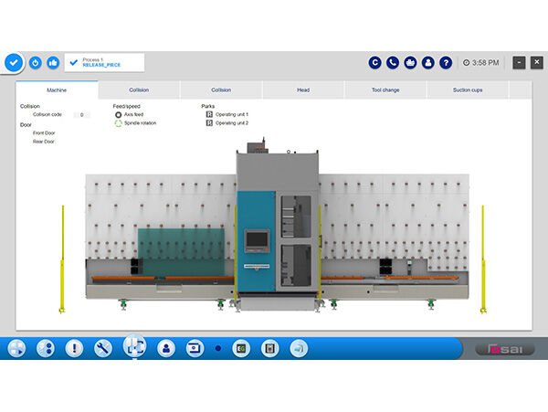 Each of the two operating units in Taktika is equipped with a water film presser, specially developed by CMS to guide the glass during machining. The presser holds the glass still for high quality machining, while a thin layer of water is interposed between the glass and the presser to ensure that the glass is supported gently and firmly without scratching. -